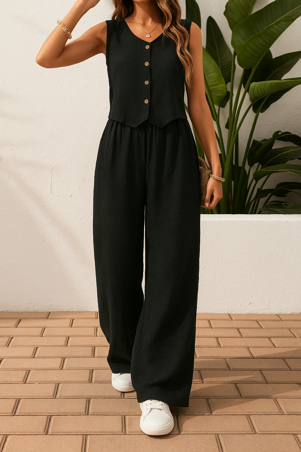 The Sarah Two-Piece Set is your go-to for days when you want to feel stylish without trying too hard. Featuring a flowy wide-leg trouser and a tailored button-down vest, this look brings together relaxed charm and elegant detail. Made from breathable cotton-linen blend, it's perfect for warm afternoons, holidays, or spontaneous coffee dates.